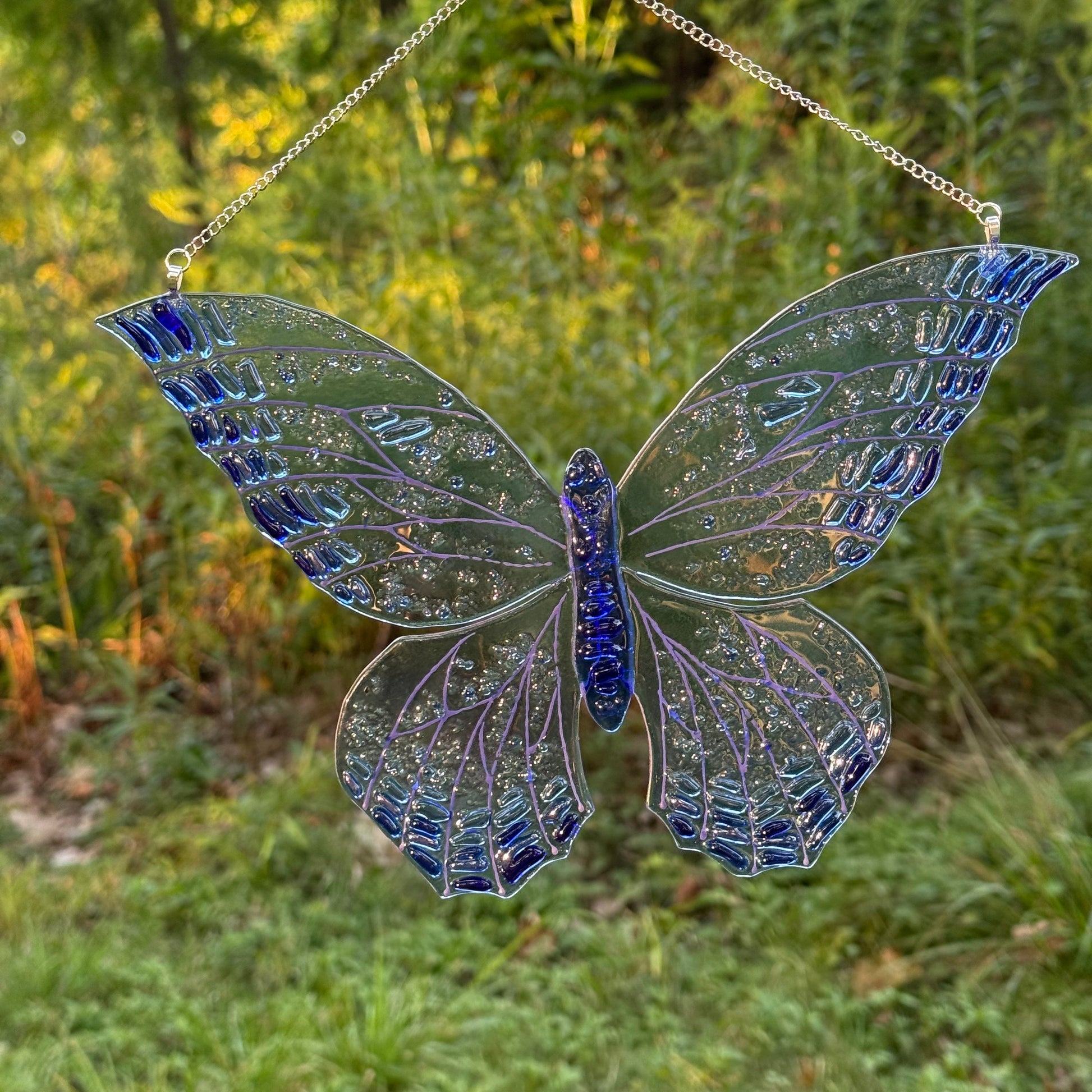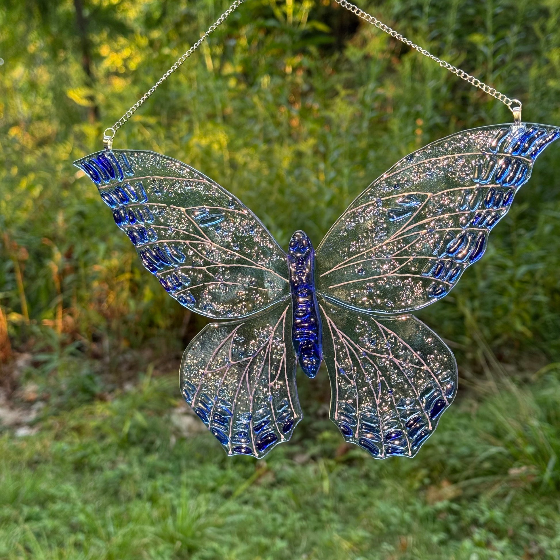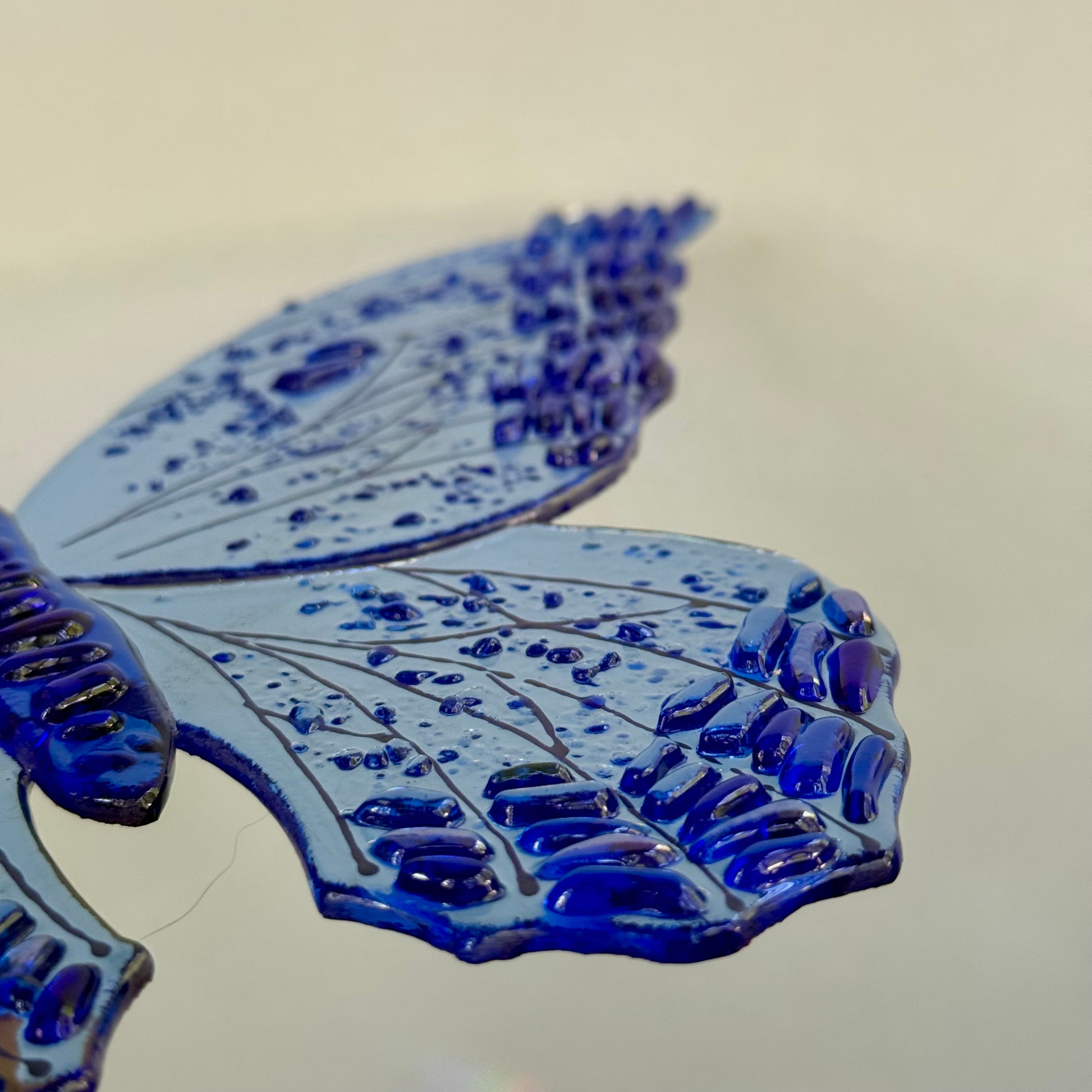 Glass butterfly made from transparent glass with oblong flakes of glass on wings to create light catching textured design.