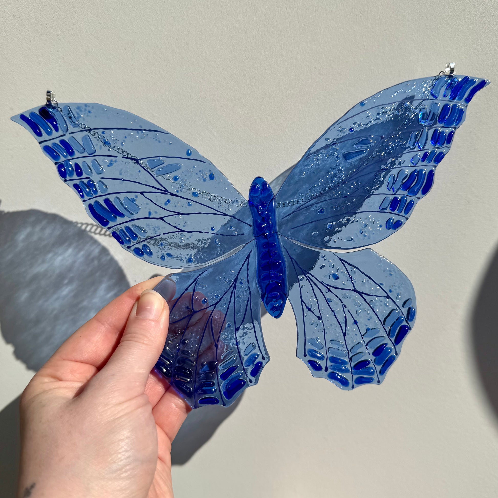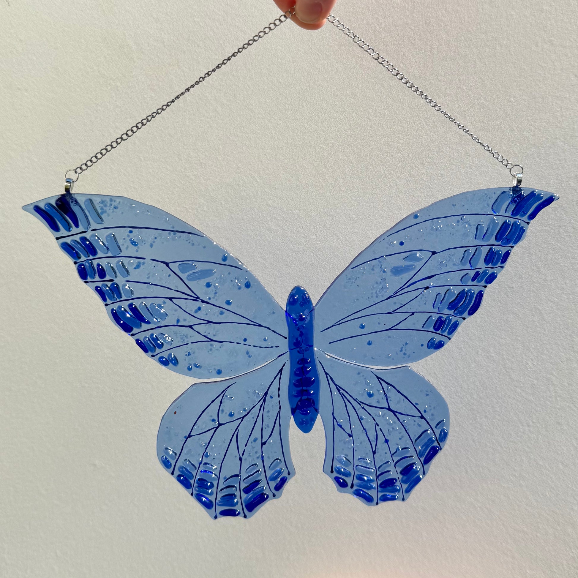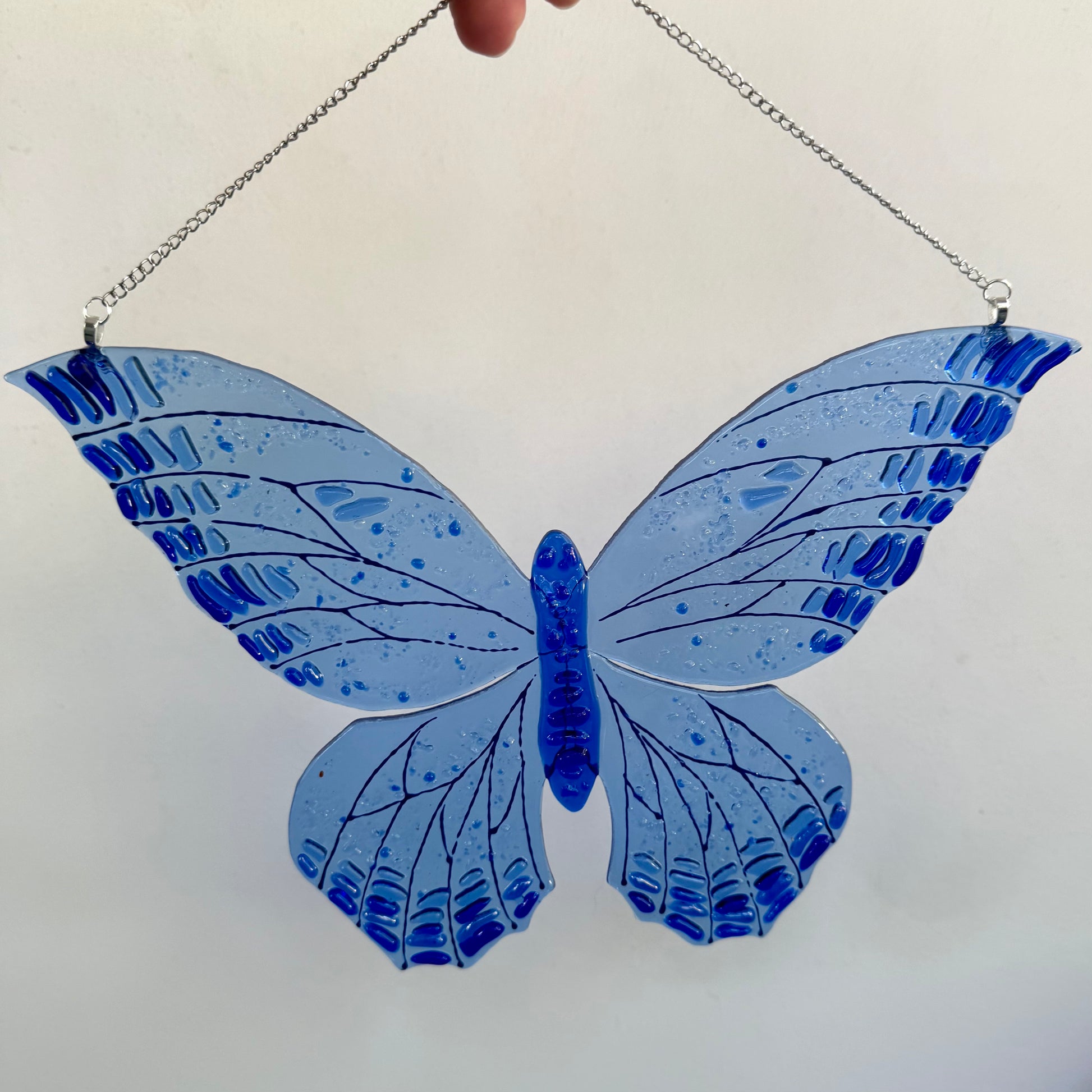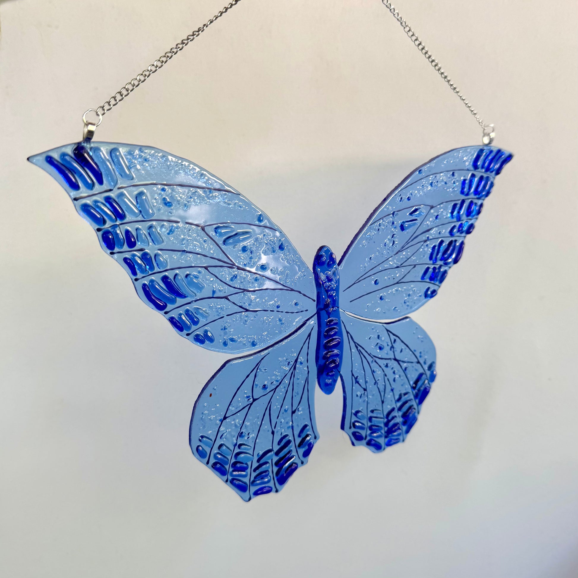 Glass butterfly made from transparent glass with oblong flakes of glass on wings to create light catching textured design.