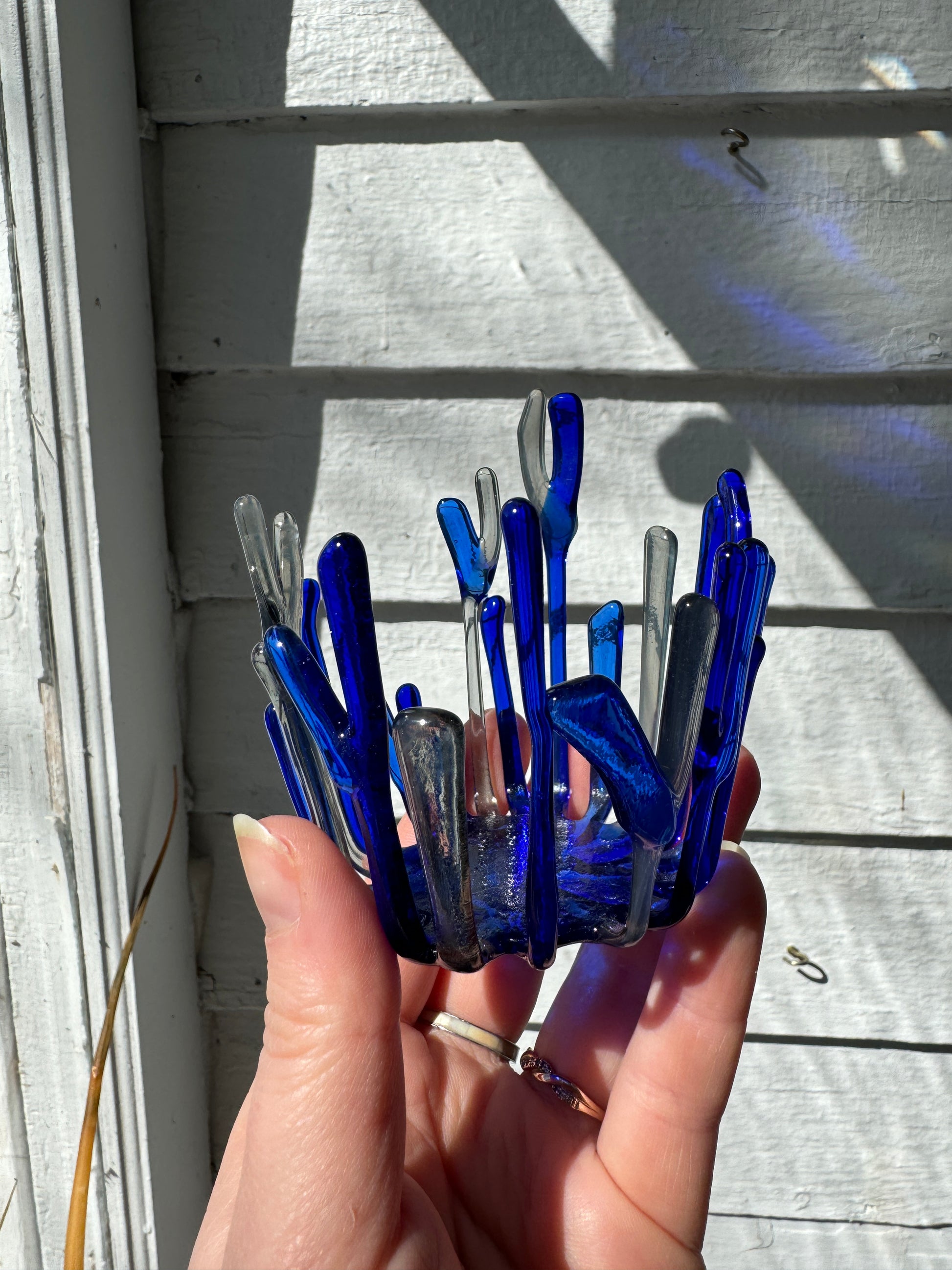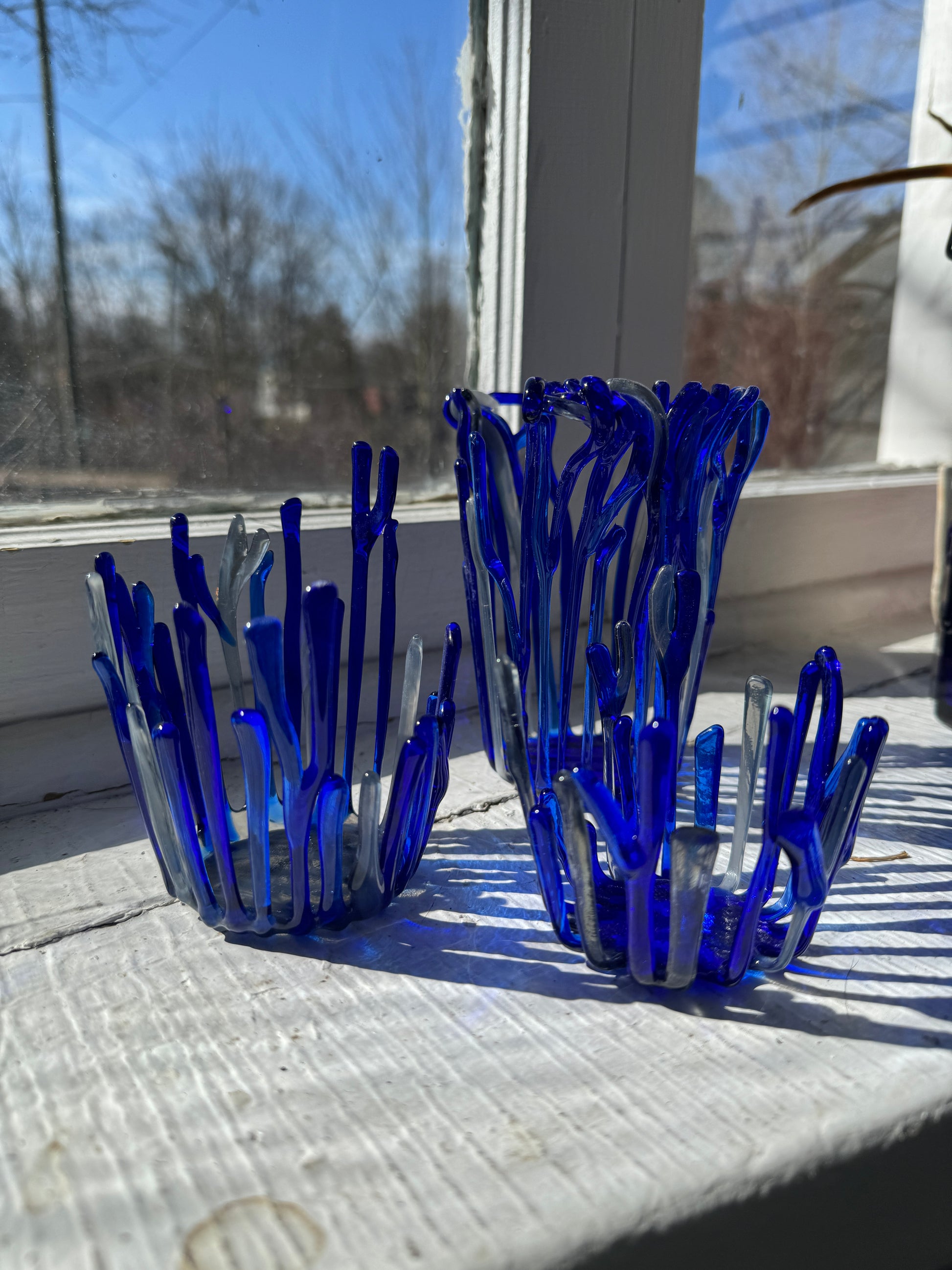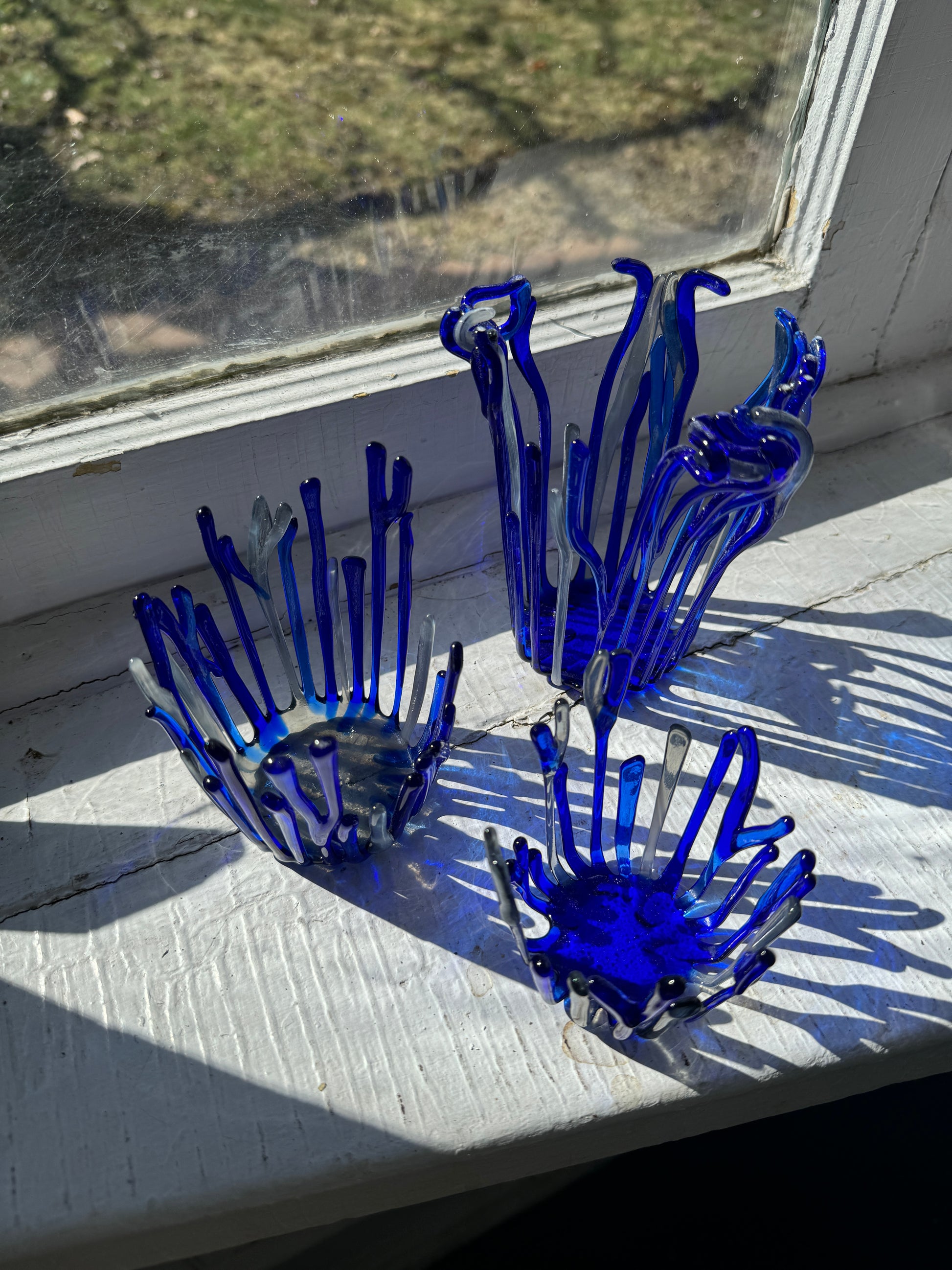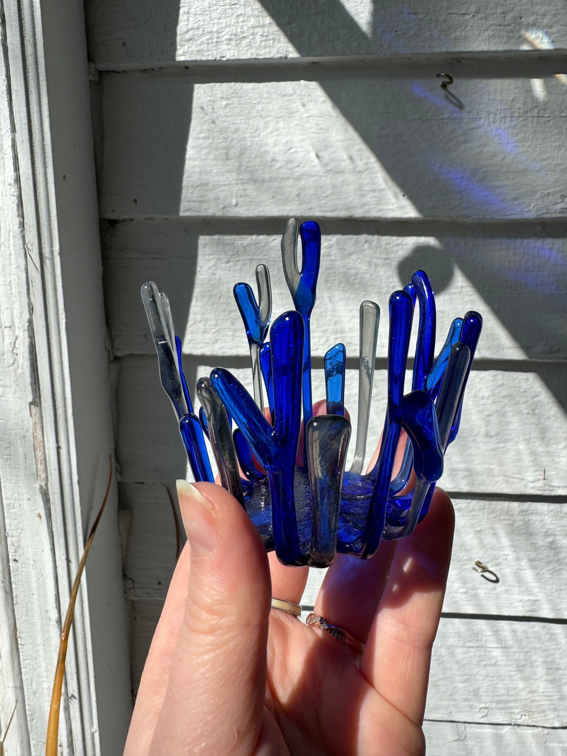 Shades of royal blue and gray transparent glass strips arranged to catch sunlight and candle light on every surface.