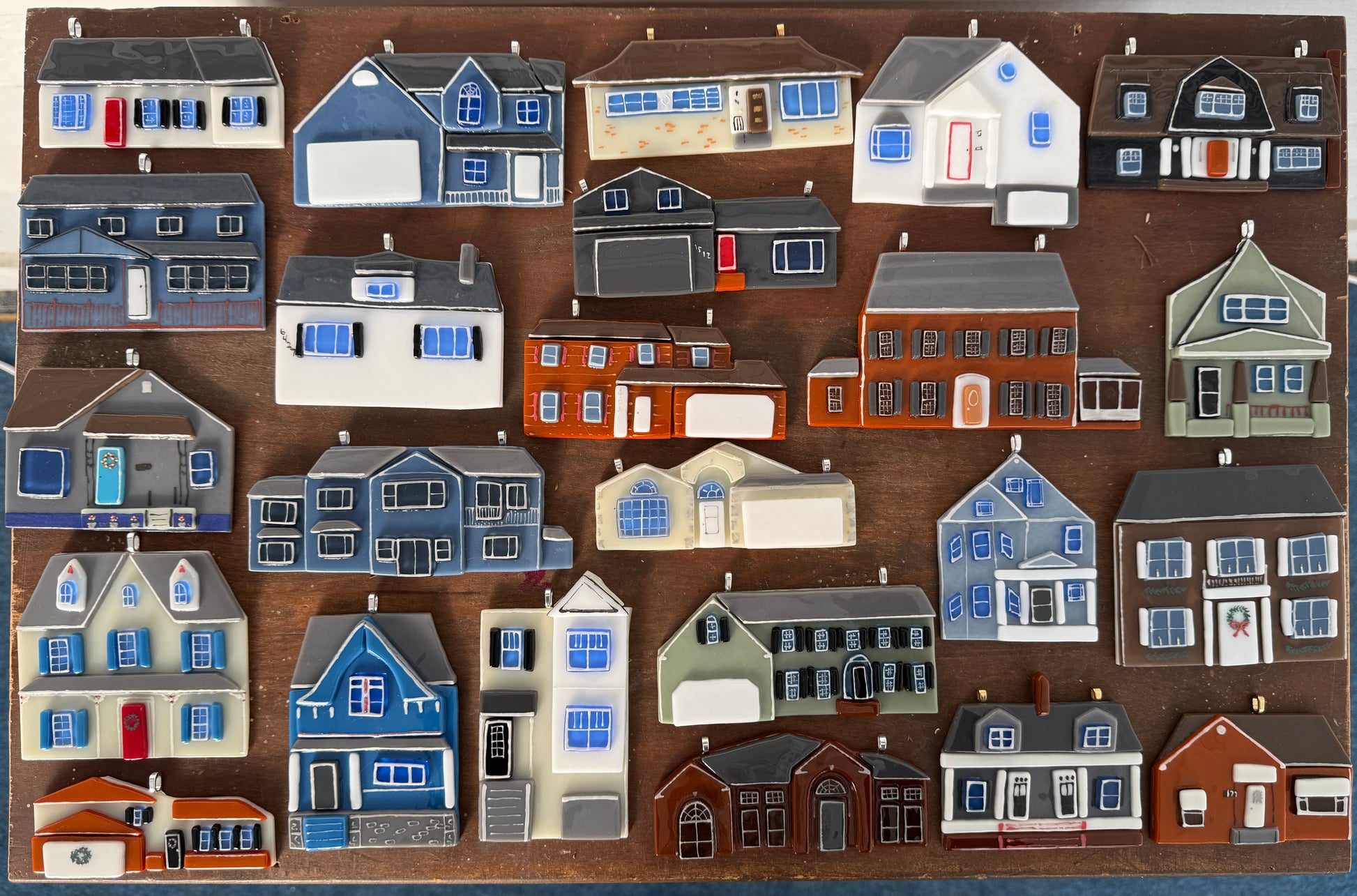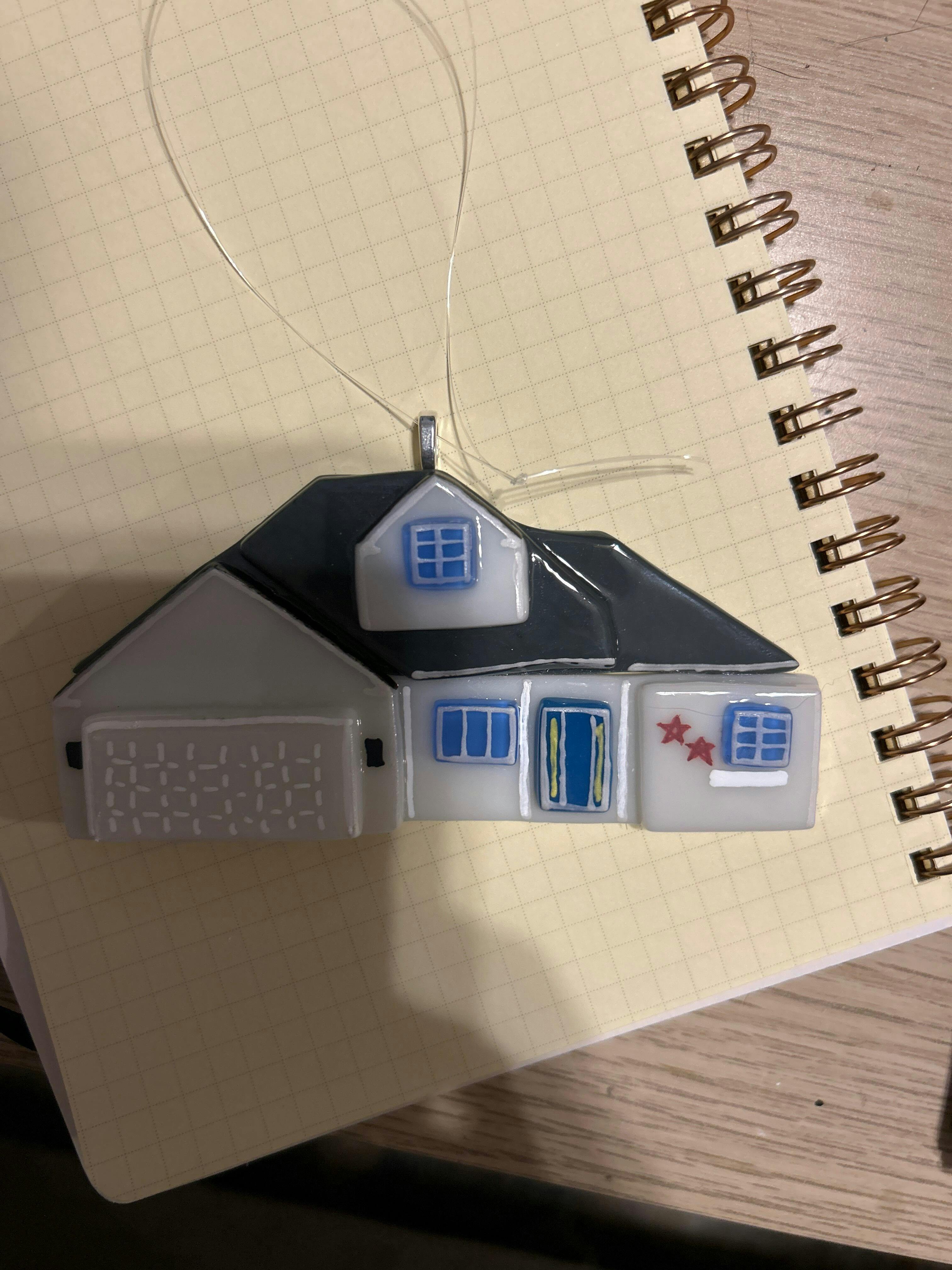 Houses will be about 2" tall, depending on the proportions and the details being captured. One or two silver or gold metal hangers with clear fishing line or chain will be attached for hanging based on width and weight unless otherwise discussed.