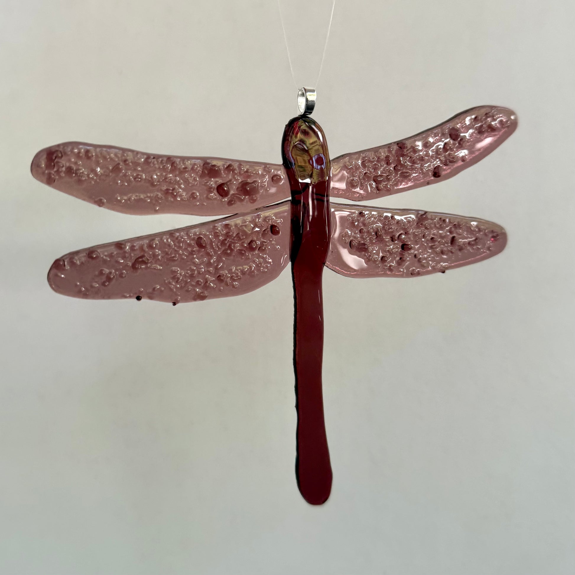 Glass dragonfly made from transparent glass with flakes of glass on wings to create light catching textured design.