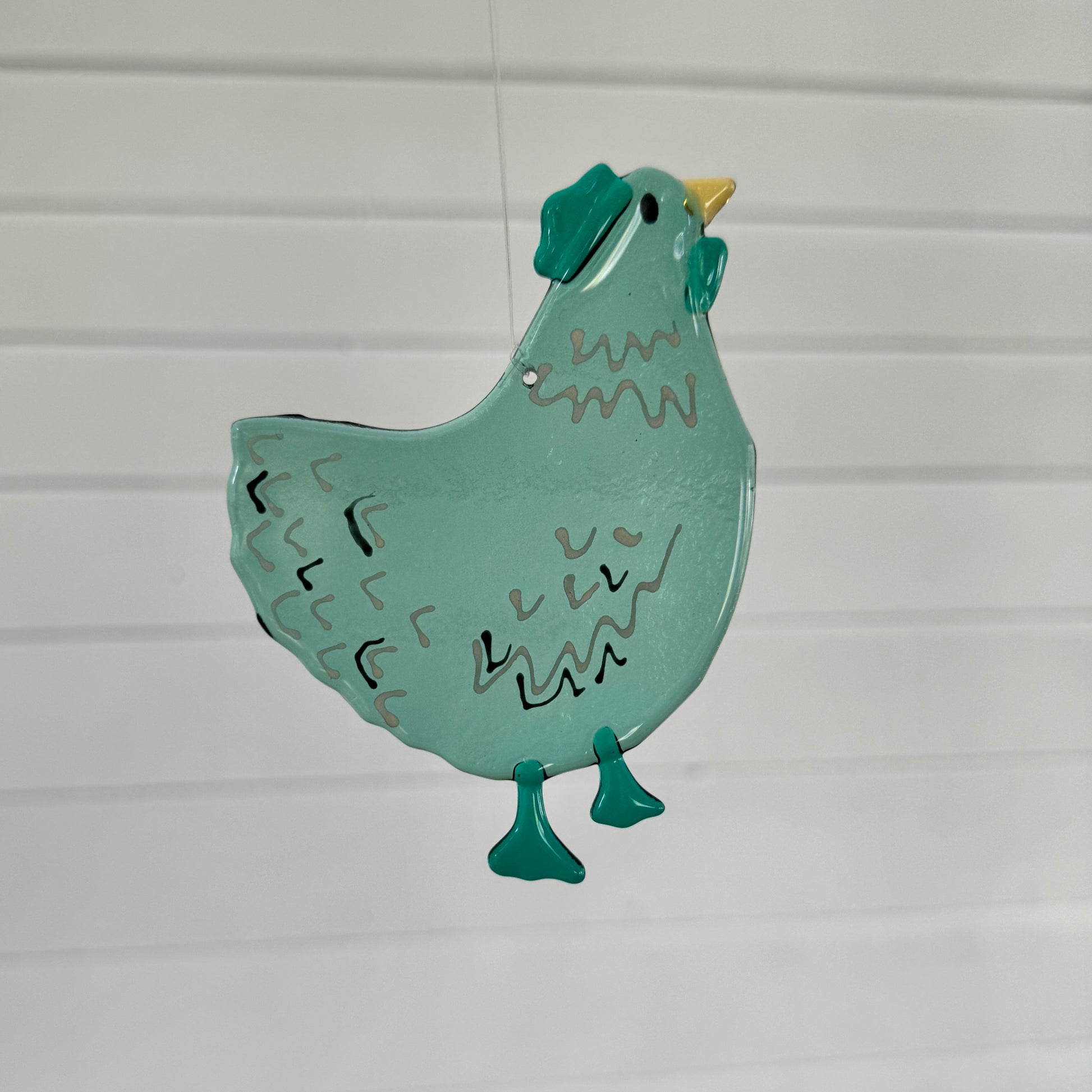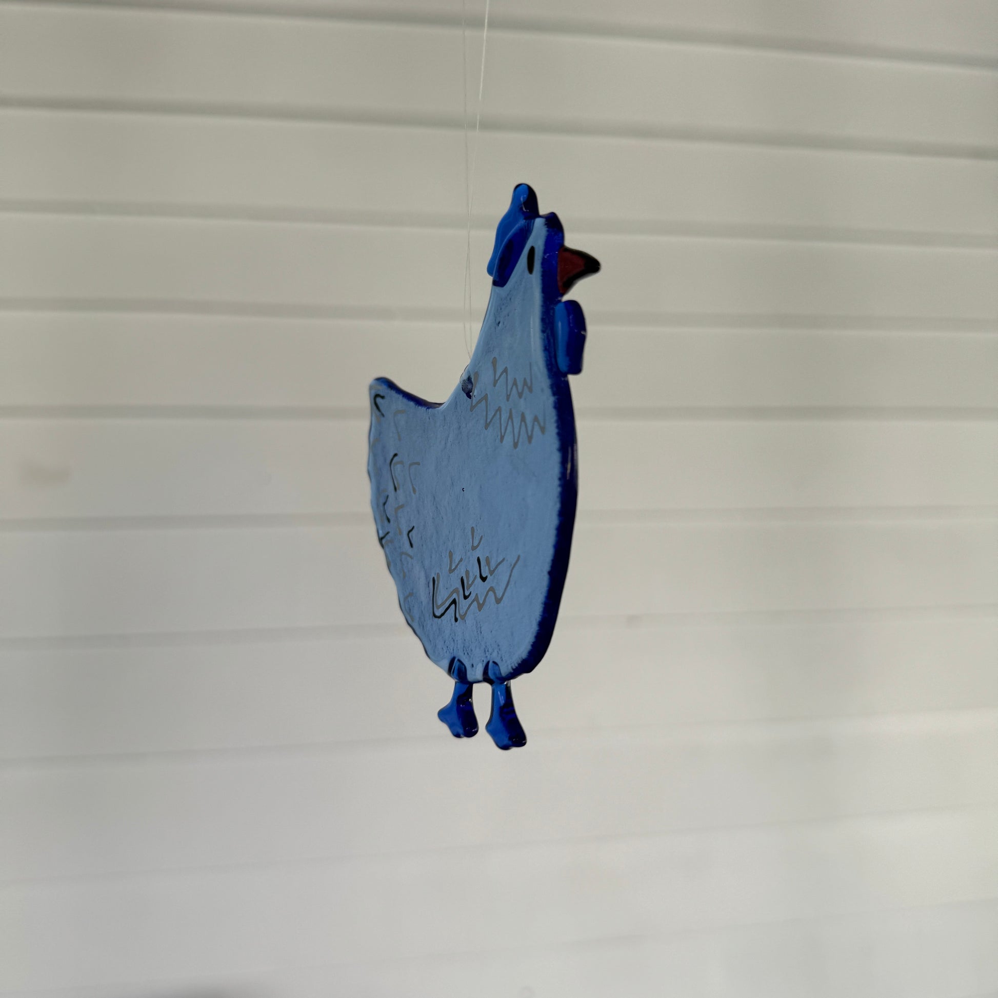 Set of three includes all but the amber hen. Details are hand-painted with white and black paint that fuses permanently to the glass.