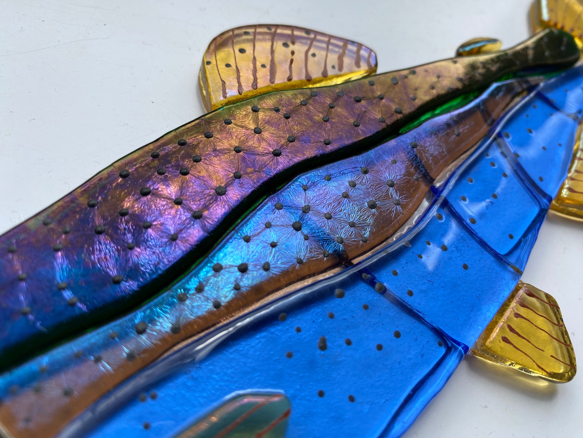 Hand-cut pieces have been shaped, filed, aligned, and fused in a firing kiln.