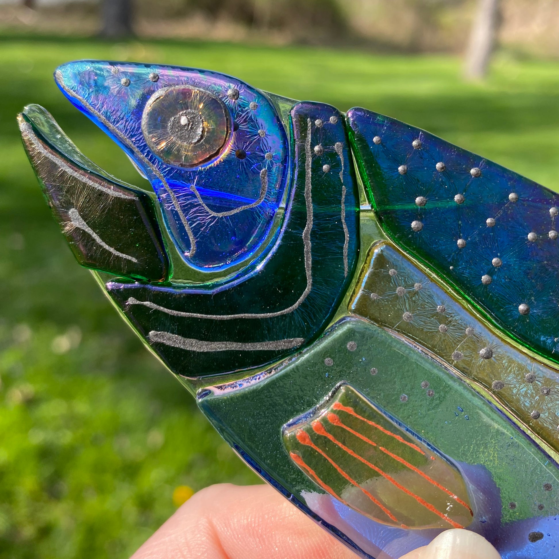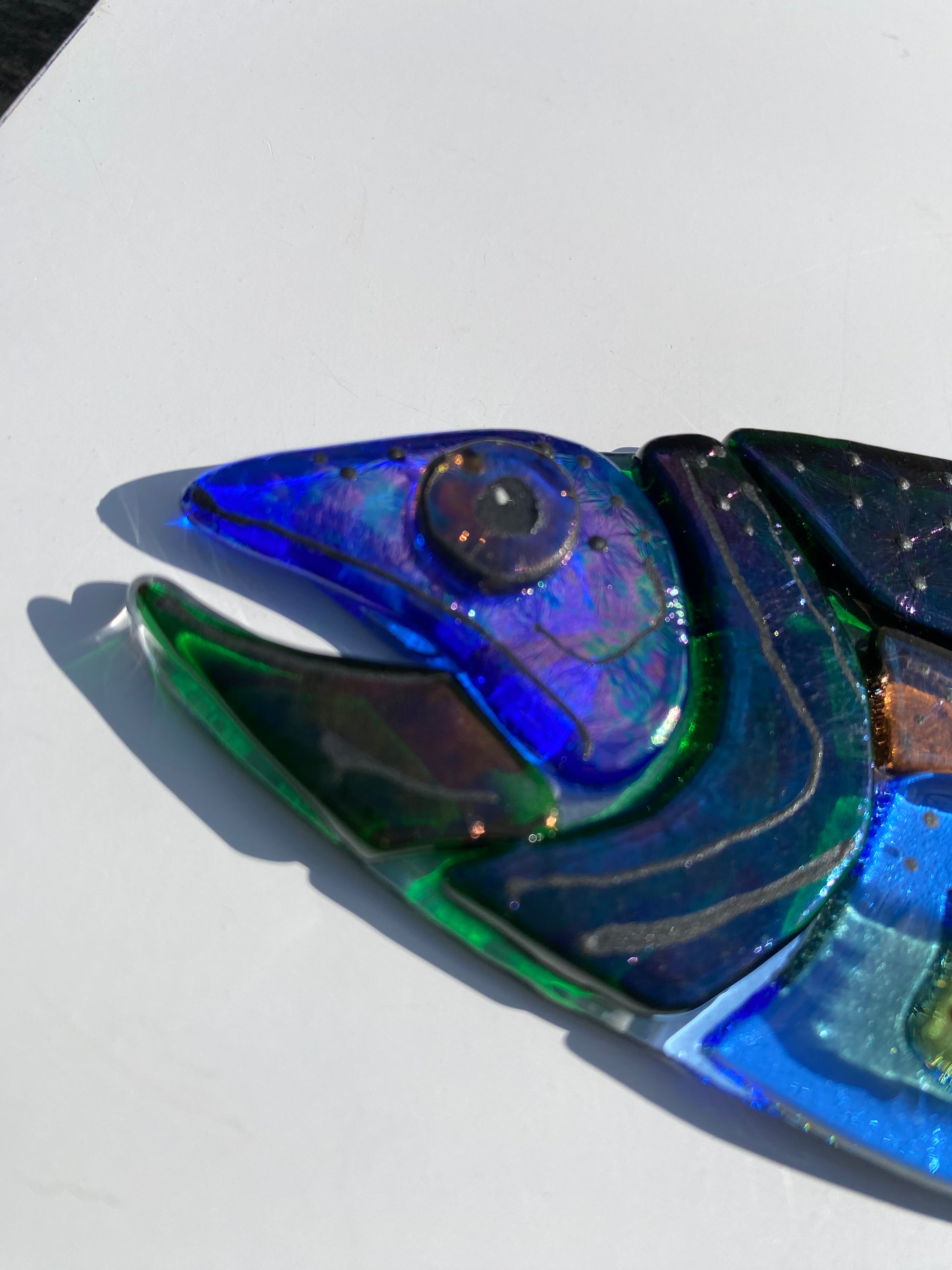 Transparent glass changes from see-through when directly backlit, iridescent in direct sun, and in-between depending on where you hang it! Silver chain attached with small silver hanging pieces adhered to the back.