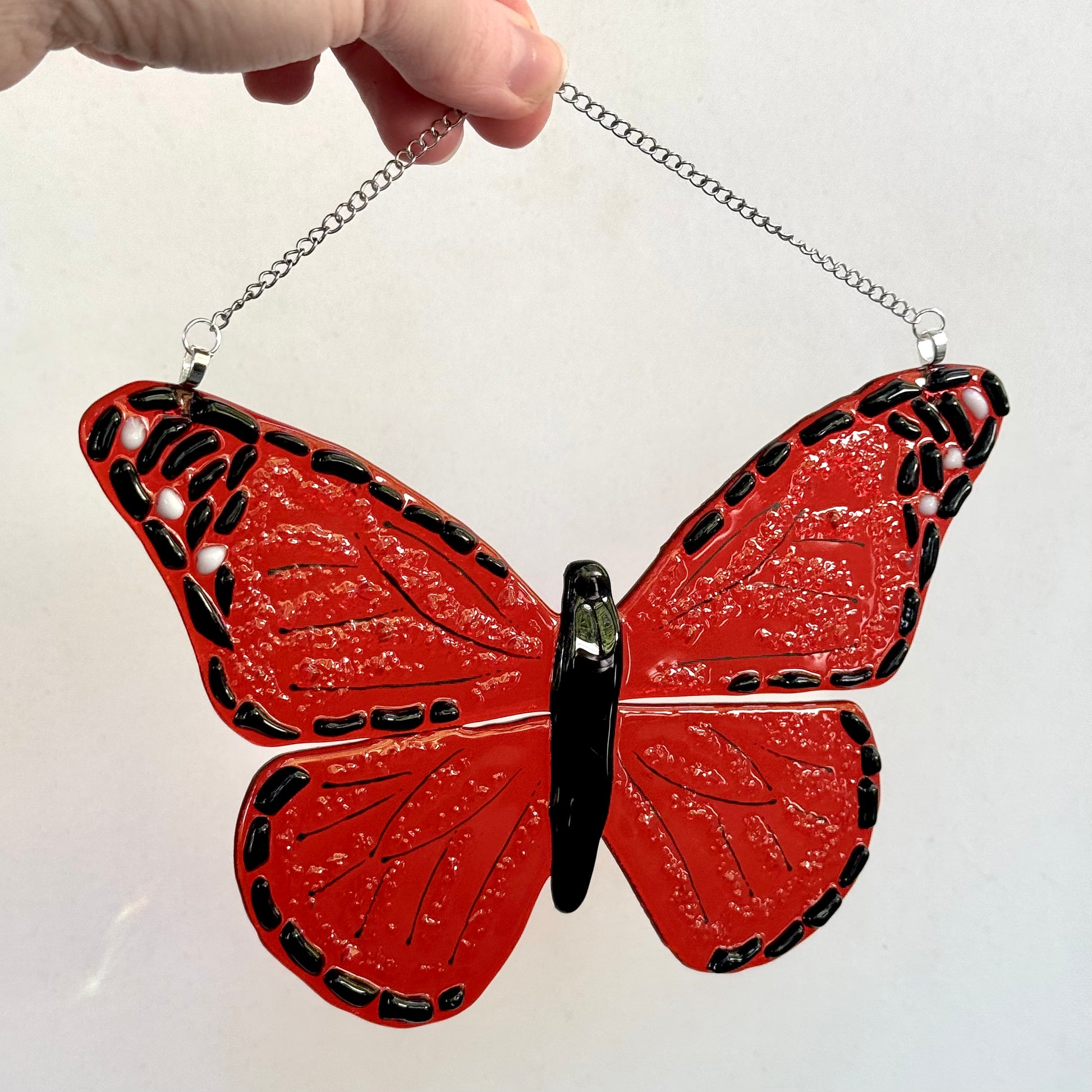 Glass butterfly made from transparent glass with oblong flakes of glass on wings to create light catching textured design.