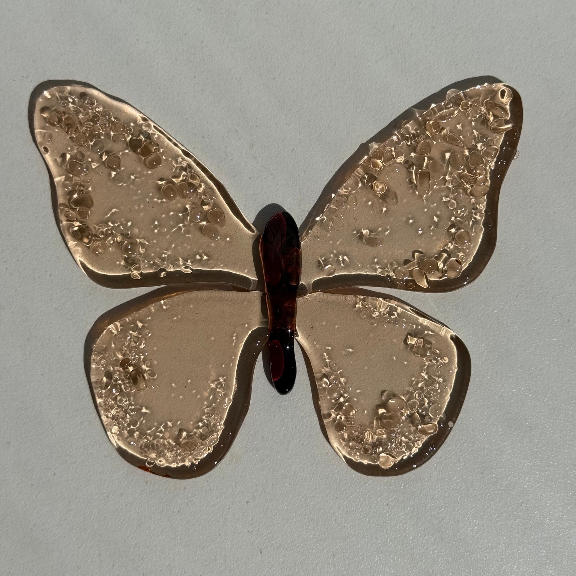 Glass butterfly made from transparent glass with flakes of glass on wings to create light catching textured design.