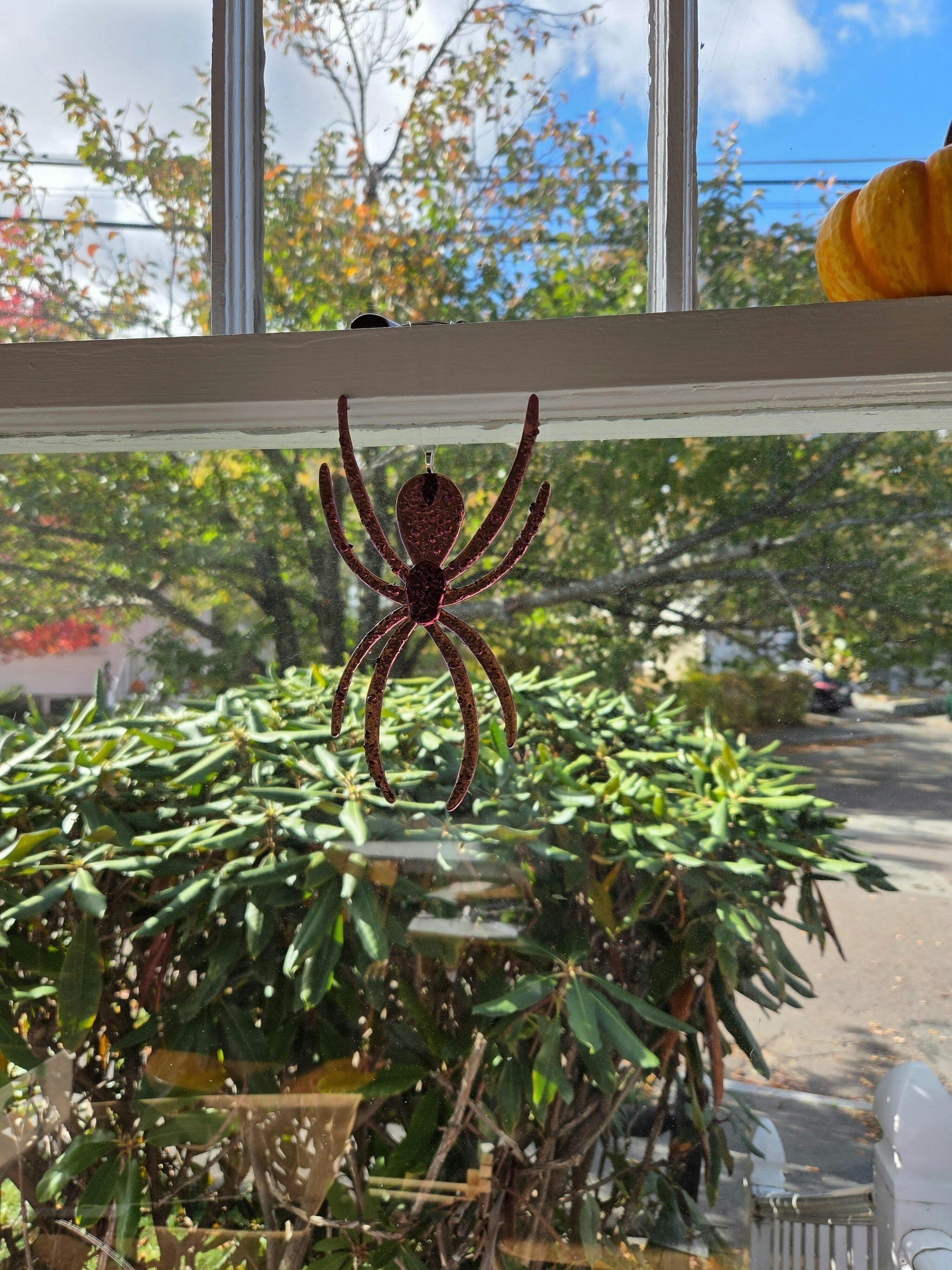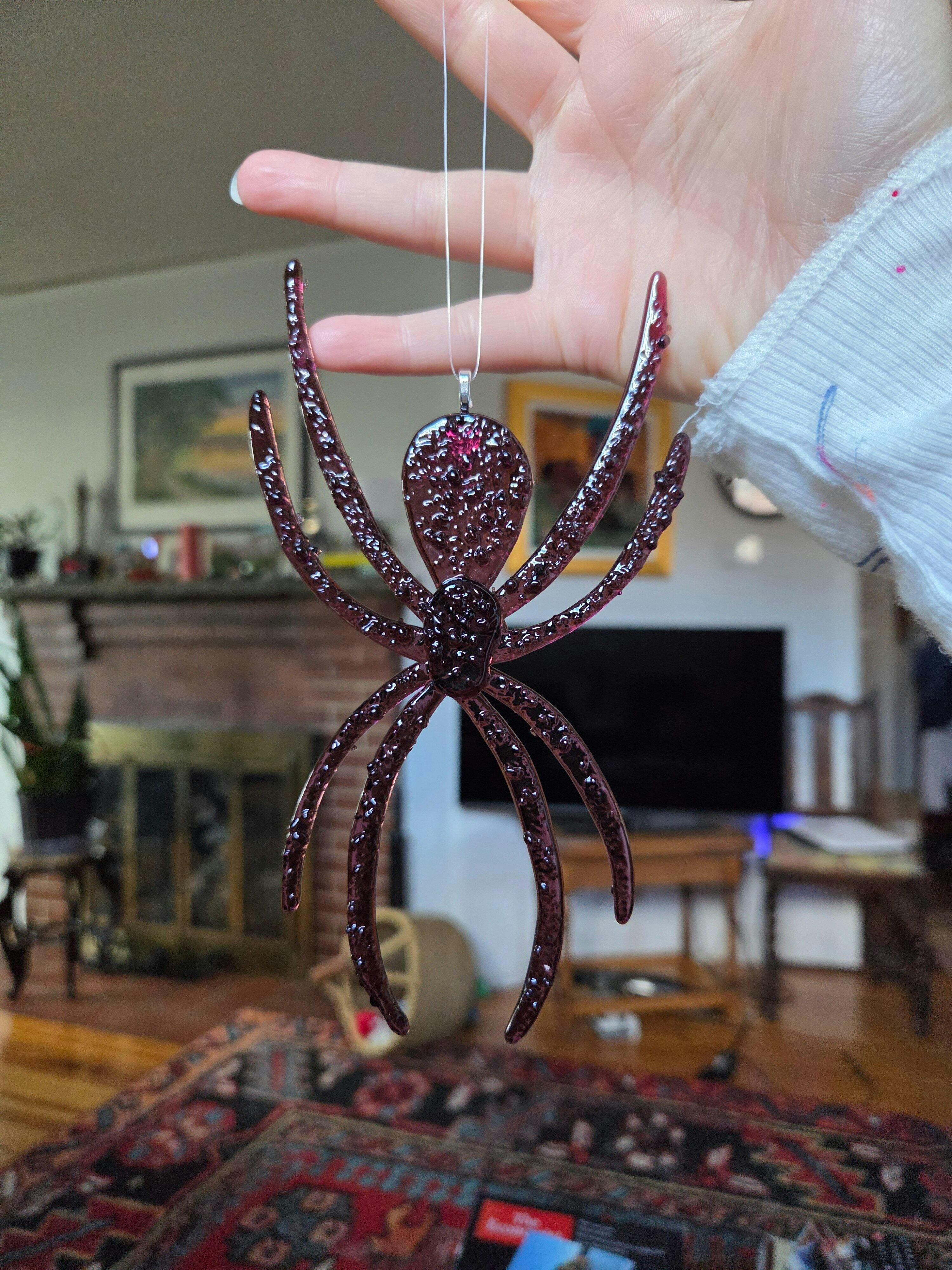 Dark violet glass spider made from transparent glass with flakes of glass on wings to create light catching textured design.